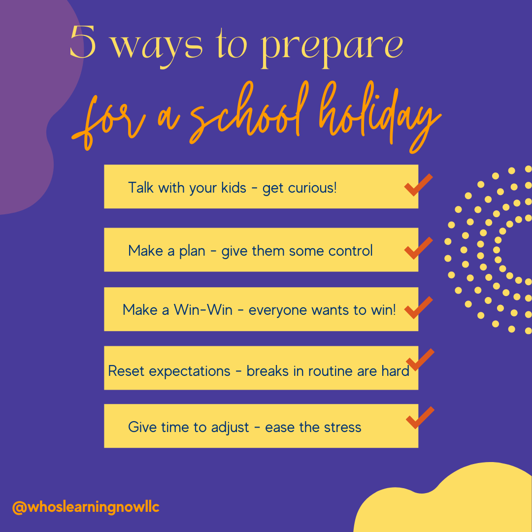 And just when you adjust to the new Fall routines, bam, here comes a school vacation. A break from school and activities can be welcoming and needed. It can also come with some frustrations. Here is a list of 5 things that you can do before, during and after any school holiday to make it a little easier, and not so frustrating.