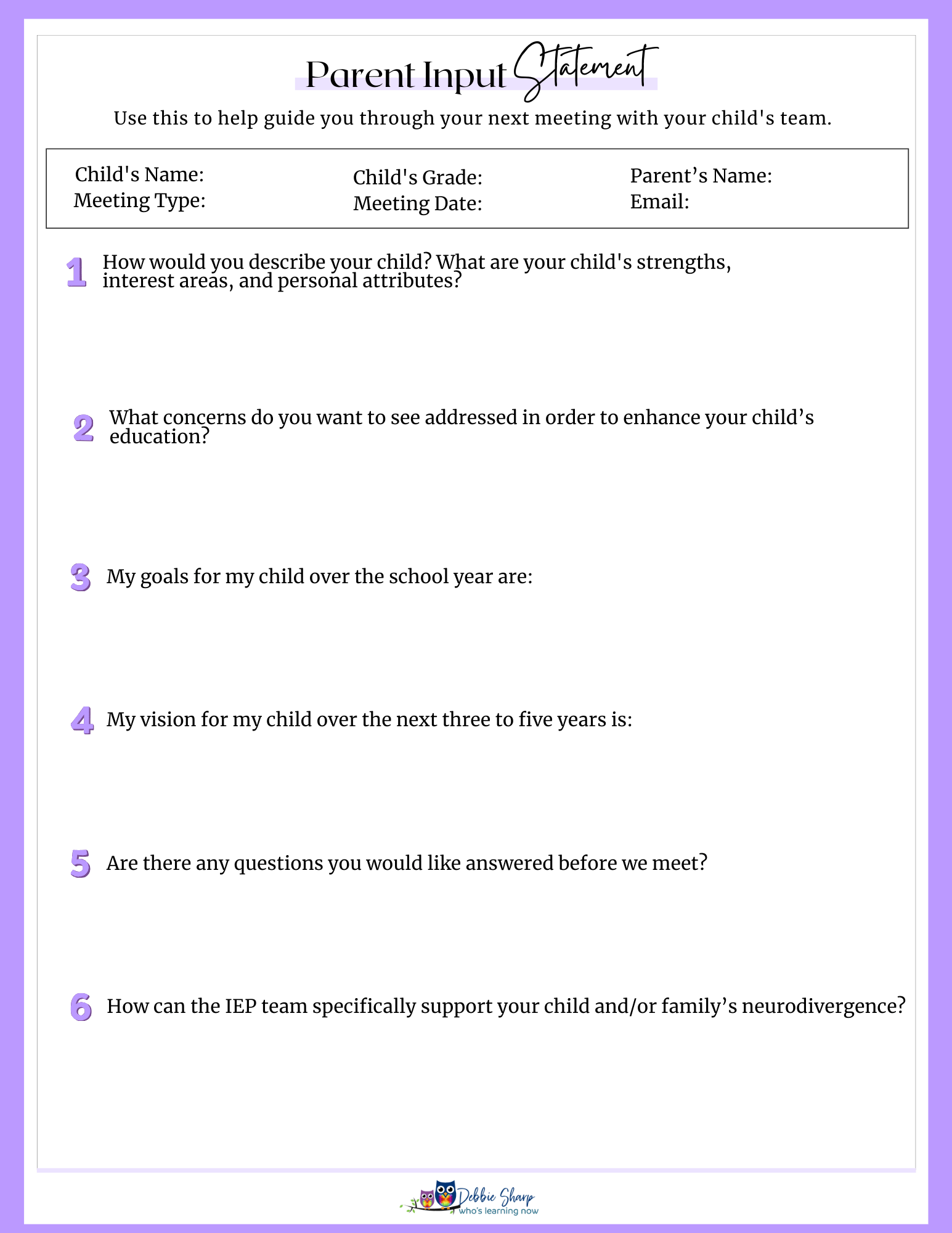 This Parent Input Statement also dives deeper into who your child really is. What do they like and dislike? What are their greatest needs so they can thrive?